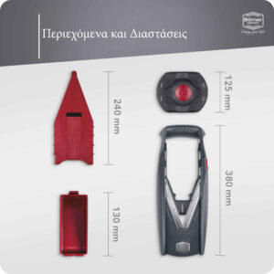 Επίσης, με τα Ένθετα Κοπής με λεπίδες των 3,5mm και 7mm κόβετε σε μπαστουνάκια στο ιδανικό μέγεθος π.χ. για τραγανές τηγανητές πατάτες ή σε κύβους μικρού ή μεγάλου μεγέθους, λαχανικά για σούπες, για εξωτικές συνταγές σε τηγάνι ή ευπαρουσίαστες σαλάτες ή φρουτοσαλάτες.  Μπορείτε να κόψετε σε τέλειους κύβους χωρίς προηγούμενη προετοιμασία, απλά στρέφοντας εναλλάξ τη Λαβή Ασφαλείας με το υλικό που κόβετε, κατά 90°